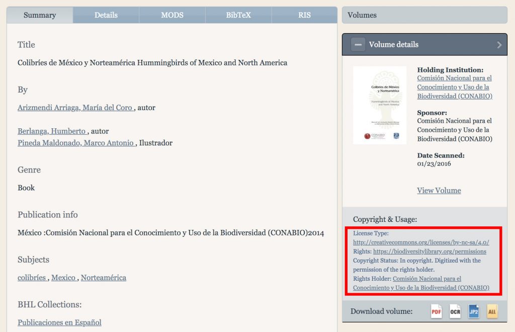 Each book’s <Copyright Status> and <Holding Institution> fields can be found as part of an item’s “Volume details”: