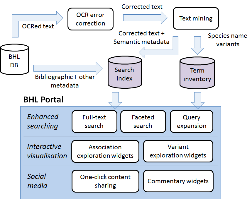 As the BHL holds an immense amount of biodiversity documents, the project will leverage text mining and visualization methods, crowdsourcing and social media to effectively serve its users with semantically enriched content. The resulting digital resource will provide fully interlinked and indexed access to the full content of BHL library documents, via semantically enhanced, interactive browsing and searching capabilities, allowing users to precisely and conveniently locate the information of interest to them.